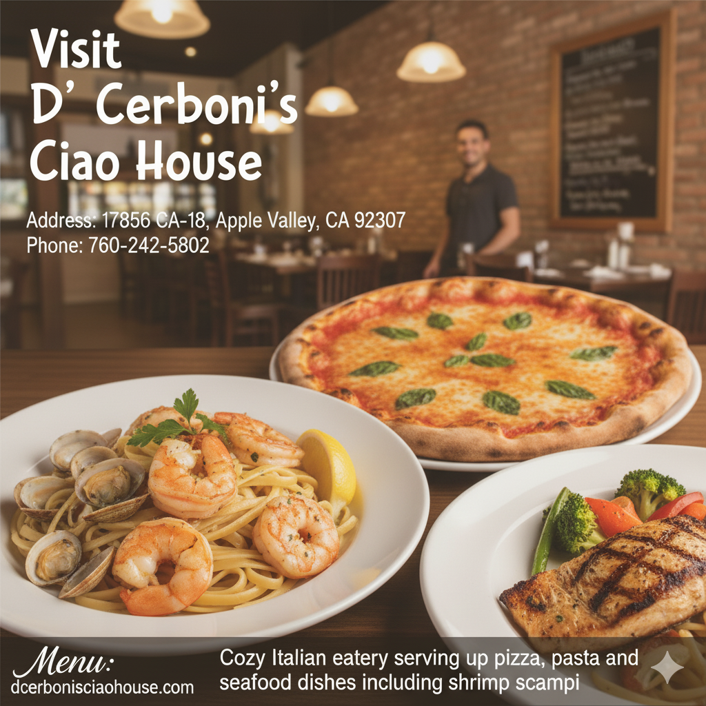 If you’re craving authentic Italian comfort food in a cozy, welcoming atmosphere, look no further than D’ Cerboni’s Ciao House in Apple Valley, California. This charming eatery has become a local favorite for its mouthwatering pizza, hearty pasta, and flavorful seafood dishes — including a shrimp scampi that diners can’t stop raving about.