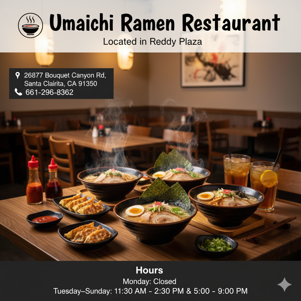 For ramen lovers in Santa Clarita, Umaichi Ramen Restaurant offers a trendy, contemporary take on Japanese comfort food. Located in Reddy Plaza, this stylish spot specializes in rich, flavorful noodle soups and Asian-style buns, complemented by a curated selection of beer and sake.