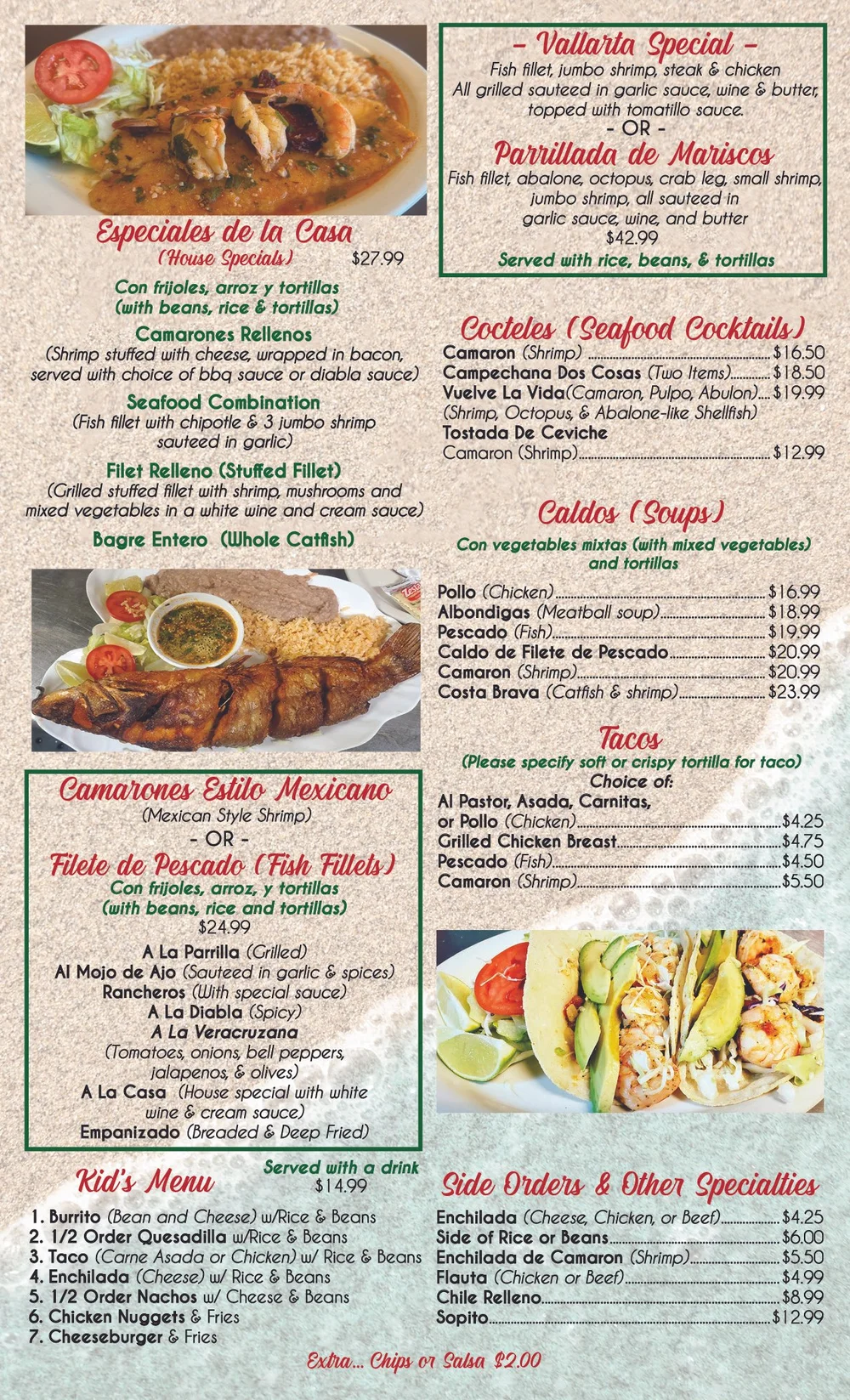 The menu tells its own story: comforting classics like tacos and enchiladas, seafood specialties inspired by the coasts of Mexico, and hearty combination plates that let guests sample a little of everything. Generous portions and bold flavors are part of their signature, but what truly sets Vallarta apart is the feeling that you’re part of something personal — a tradition of hospitality where every customer is welcomed like family.
